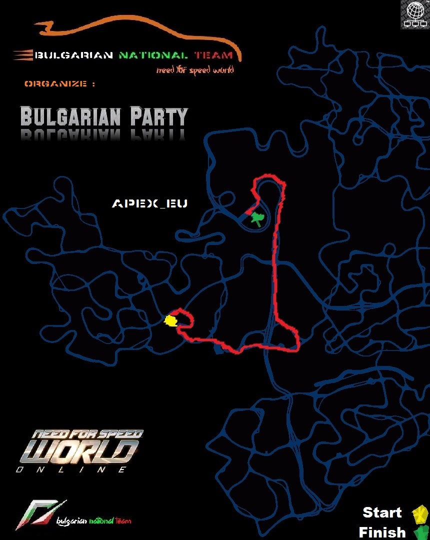 Приятели,тази Неделя 5-ти Април 2015 ''Bulgarian National Team'' организира ''Bulgarian Party'' в Need For Speed World. Ще се съберем всички Българи в 20:00 BG-време,и във 20:15 тръгваме до посоченото място на снимката от доле,ще караме под 100 км/h и водещия ще бъде | BULGAR | със McLaren F1. Целта е, да покажеме на другите страни че има Българи във играта и че сме номер едно Emoticon wink Дано да се съберем, и ви пожелавам ви приятен празник!!!